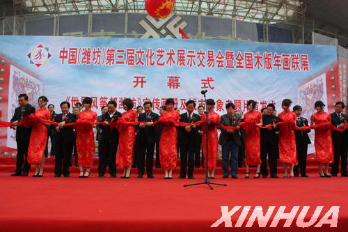 新华网山东频道4月19日电(孙廷友)18日上午,山东潍坊富华国际会展中心彩旗飘扬,人头攒动,中国(潍坊)第三届文化艺术展示交易会暨全国木板年画联展在这里隆重开幕。
