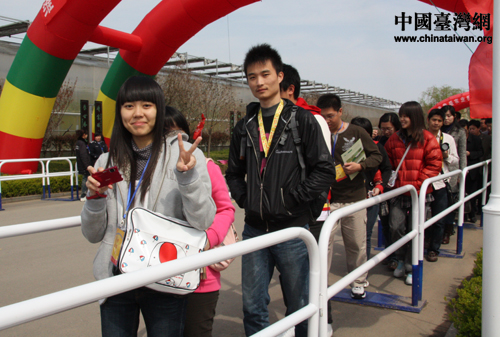 中国台湾网4月22日潍坊消息  由台湾明道大学、新竹磐石中学的师生们组成的文化教育交流访问团今日到访潍坊寿光市,参观了第十一届中国(寿光)国际蔬菜科技博览会。精致的展馆给同学们留下深刻的印象,纷纷合影留念。