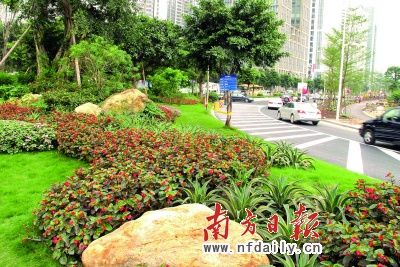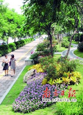 广州大道、临江大道原来都是“有绿无景”,树木生长茂盛,却谈不上什么景观。改造后,把树木抽疏,使景观豁然开朗;用小土坡营造“微地形”,使视觉变化更丰富;植物高地错落,营造出丰富的层次;花卉四季搭配,一年中“花开不败”。绿化带中增加了弯弯曲曲的园路,行至其中,一花一石都颇具岭南园林的风格。