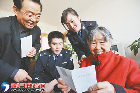 从台湾省台中市回来的张桂兰老人(右)从市公安局出入境管理处警官手中拿到了办理好的台湾居民定居证。张桂兰老人今年89岁,因儿子在东营定居,于2009年1月14日向市公安局出入境管理处提出申请办理台湾居民定居证,经过审批成为山东东营第一位拥有台湾居民定居证的市民。(记者 刘文忠 通讯员 王小杰 报道)