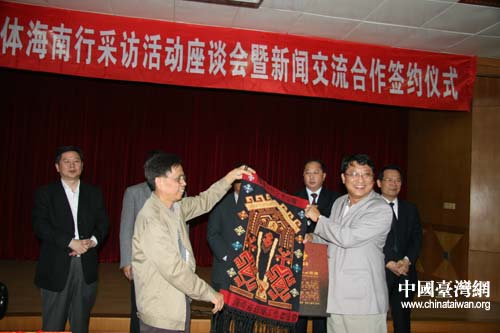中国台湾网11月30日海口消息 “两岸媒体海南行”活动昨日举行座谈会,来自台南12家媒体的20多位台湾记者与大陆同行进行充分交流,大家一致认为,以后应该多办一些类似活动,让两岸双方能有更进一步的交流沟通。图为两岸记者代表互赠礼品。(李杰)