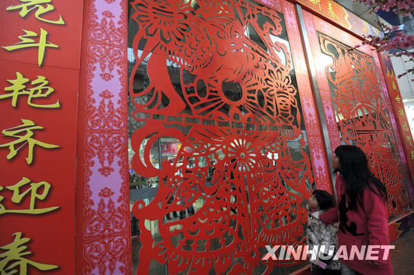 2月1日,两个孩子在合肥市步行街观看商场橱窗上粘贴的巨大窗花。