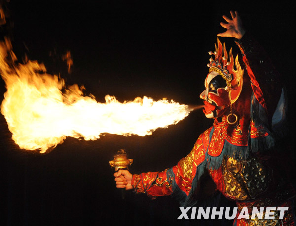 2月19日,来自四川成都的演员在台北海峡两岸宗教文化艺术观光节上表演喷火绝技。