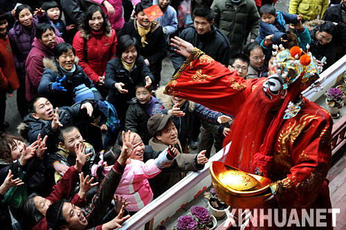 2月9日,演员扮成的“财神爷”向观众抛洒“红包”。