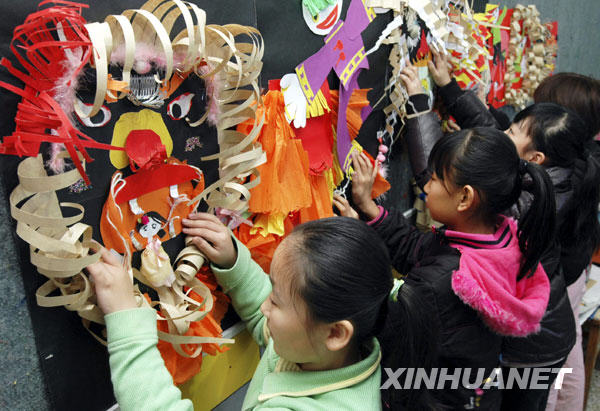 据悉,孩子们巧手制作的虎头鞋、龙灯、花灯、舞狮等手工作品,将参加明年一月在广东举行的《当代城市儿童美术教育与本土文化的传承》作品展览。新华社发(董乃德 摄)