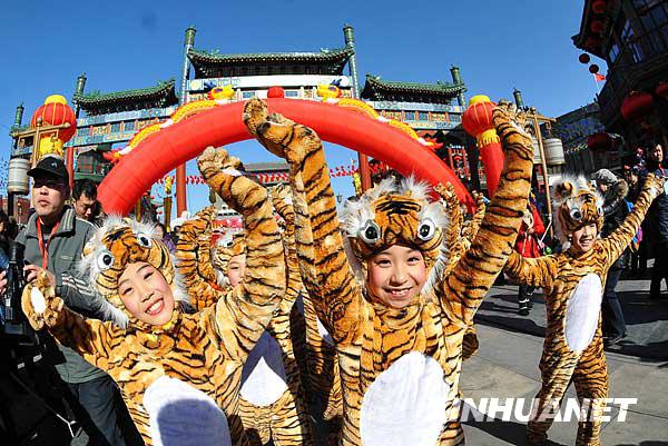 1月31日,一队由小朋友扮演的“小老虎”在前门步行街进行踩街表演。当日,2010年北京春节系列文化活动正式启动。本次活动持续1个多月,将开展160多项文化活动和万余场群众性演出,让北京市民在春节前后享受文化盛宴新华社记者罗晓光摄