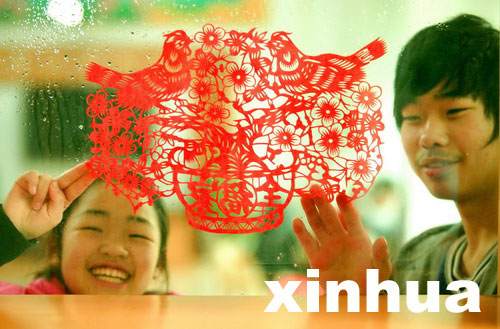 2月3日,湖北恩施ESS儿童村里的孩子在窗户玻璃上贴窗花。春节将至,生活在湖北恩施ESS儿童村里的20多名孤儿写春联、贴窗花、挂彩带,把儿童村装扮得充满年味。新华社照片(田代明 摄)