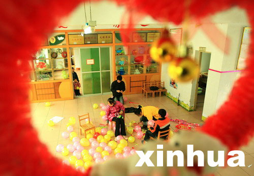 2月3日,湖北恩施ESS儿童村里的孩子们在忙着布置房间。新华社照片(田代明 摄)