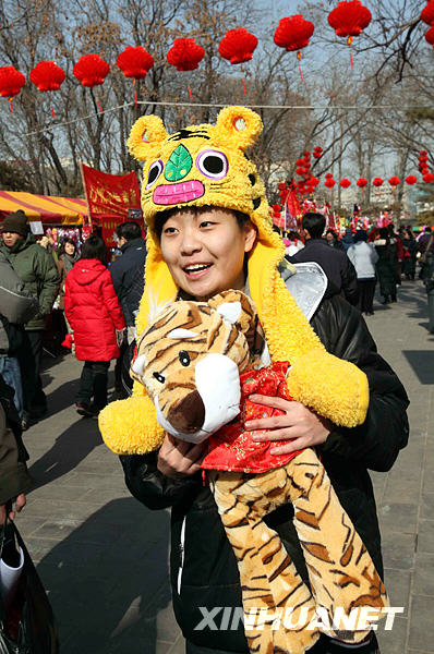 2月13日,一位女孩头戴“虎帽”,抱着虎玩偶在北京地坛公园逛庙会。新华社发(陈晓根 摄)
