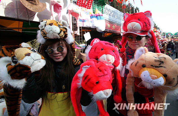 2月13日,两位年轻人在北京地坛公园展示“虎帽”。农历虎年即将来临,各种虎主题玩具成为春节庙会上的宠儿。新华社发(陈晓根 摄)