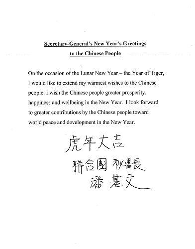 联合国秘书长潘基文2月12日通过新华社等中文媒体向中国人民祝贺春节。他在用英文发表的贺词中说:“值此农历新年‘虎年’到来之际,我谨向中国人民致以最热烈的祝贺。祝愿中国人民在新的一年里更加幸福安康。我期待着中国人民在新的一年里为世界和平与发展作出更大贡献。”潘基文还亲笔书写汉字贺词,祝愿中国人民“虎年大吉”。新华社发