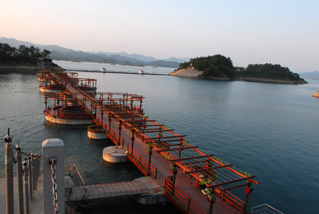 千岛湖上的幸运桥是目前中国跨度最大的水上浮桥,总长230米。桥上采用无土栽培技术,偏植瓜果花草和水生植物,桥身两侧喷泉抽取千岛湖深层恒温湖水,在桥身上空交错排列形成"秀水走廊",也是桥上的天然空调。