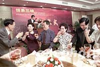 “情系三峡--两岸文化联谊行”活动01年7月16日晚在重庆正式拉开帷幕,来自海峡两岸的200余位文化界人士将沿长江三峡进行为期7天的中华文化交流与研讨。图为文化部副部长孟晓驷(左2)、中国作家协会副主席王蒙(左3)与台湾代表共同举杯庆贺。中新社记者 毛建军 摄