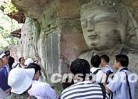 前来重庆参加“情系三峡——两岸文化联谊行”活动的两岸文化界人士,01年7月16日参观位于重庆市大足县的大足石刻。宏伟壮观的大足石刻,距今已有1000多年的历史,被联合国教科文组织列为世界文化遗产。中新社记者 毛建军 摄