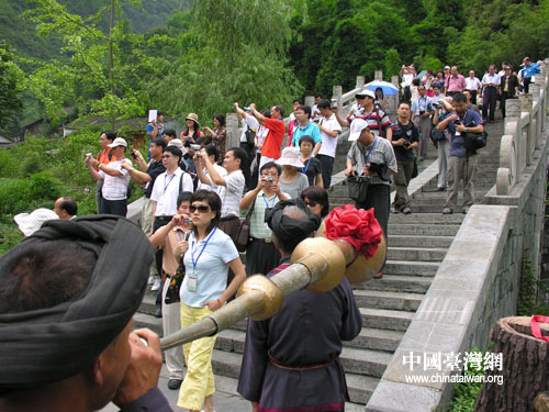 中国台湾网7月14日湖南吉首市消息 “情系湖湘——两岸文化联谊行”大型交流活动进入第五天,参加活动的两岸文化界人士走进湖南湘西苗族土家族自治州,感受到了浓浓的苗族、土家族风俗民情与悠久文化。