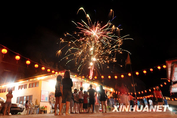 2月14日,在马来西亚柔佛州的居銮,当地华人燃放烟花,庆祝虎年春节的到来。新华社发(张纹综摄)