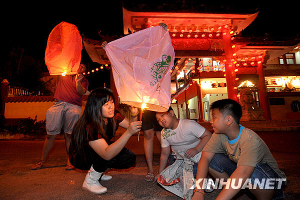 2月14日,在马来西亚柔佛州的居銮,当地华人点放孔明灯,庆祝虎年春节的到来。新华社发(张纹综摄)