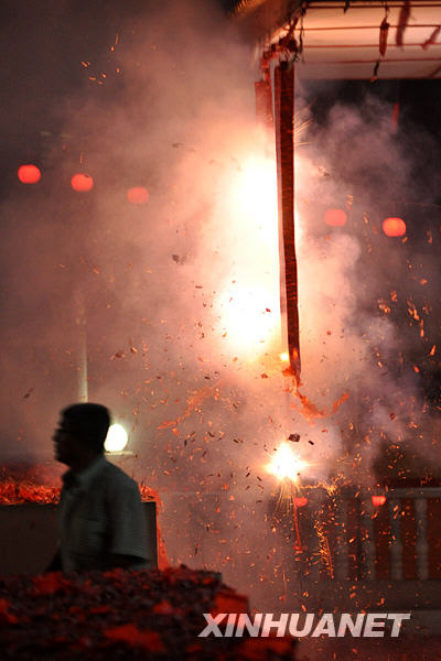 2月14日,在马来西亚柔佛州的居銮,当地华人燃放鞭炮,庆祝虎年春节的到来。新华社发(张纹综摄)