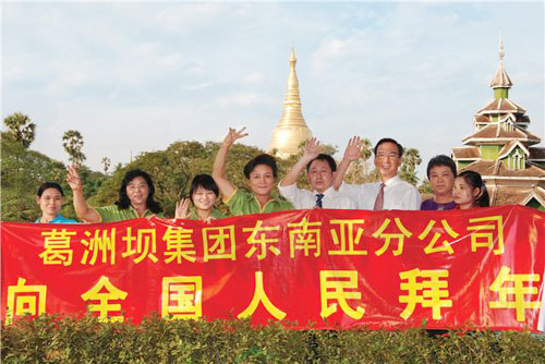 葛洲坝集团东南亚分公司在缅工作人员在缅甸著名的仰光大金塔旁向全国人民拜年!葛洲坝集团承建缅甸耶涯水电站(69万千瓦) 大坝工程,采用国内国际领先技术精心施工,受到中缅方的一致好评。中国有几十家大公司在缅甸市场拼搏,参与了多项缅甸特大项目的建设。缅甸两家孔子课堂通过新华网向全球华侨华人拜年