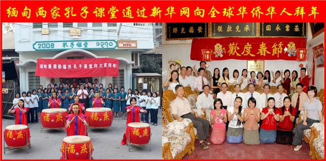 缅甸曼德勒福庆孔子课堂校长师生(与云南大学合作,2008年成立,左图)和仰光福星电脑与语言学苑孔子课堂中缅方负责人及师生(与厦门华侨大学合作,2009年成立,右图)通过新华网向全球华侨华人拜年!