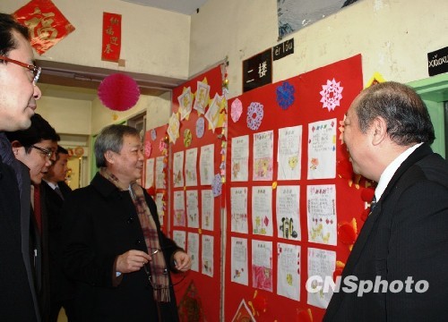 当日时间2月23日下午,“文化中国·四海同春”亚洲艺术团团长熊昌良、副团长雷振刚等一行参观了横滨山手中华学校正在使用的旧校舍和即将在今年4月投入使用的新校舍。图为该校校长潘民生向熊昌良一行介绍旧校舍里张贴的华侨子弟们为新年写的中文贺词。 中新社发 关妍 摄