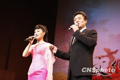 “文化中国·四海同春”文艺晚会28日晚为纽约华人华侨们献上了一台精彩演出。当晚适逢正月十五,演员和台下观众情绪高涨、互动不断,令演出在纽约掀起一轮高潮。图为当晚阎维文和雷佳合唱“敖包相会”。 中新社发 魏晞 摄