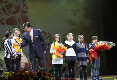 中新网3月3日电 当地时间3月1日晚,国务院侨办副主任任启亮率领的“文化中国·四海同春”访演团在帕多瓦大剧场为意大利威尼托大区3000多华侨华人及意大利友人送上新春祝福。中国驻米兰副总领事何凤云、帕多瓦省省长维多里奥·卡萨林、帕多瓦副市长罗西等与观众共享艺术盛宴。图为艺术家刘斌与献花的孩子们互动。