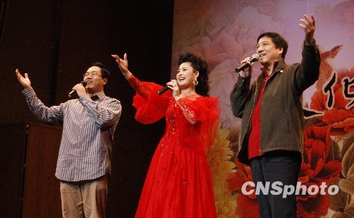 “文化中国·四海同春”文艺晚会28日晚为纽约华人华侨们献上了一台精彩演出。当晚适逢正月十五,演员和台下观众情绪高涨、互动不断,令演出在纽约掀起一轮高潮。现场观众也不断为演出制造惊喜:当著名歌唱家梦鸽希望和一位现唱观众合唱“天仙配”时,有两位热情的男歌迷同时冲上了舞台,而且都唱功了得,获得喝彩一片。 中新社发 魏晞 摄