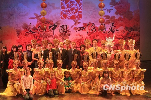 26日晚,中国国务院侨办2010年春节“文化中国·四海同春”艺术团在能容纳2500名观众的日本爱知县艺术剧场举行盛大演出,为当地华人华侨和日本观众带来新春的祝福。图为演出结束后中国驻名古屋总领事张立国、艺术团团长熊昌良与演职人员、当地华侨华人代表合影。 中新社发 关妍 摄