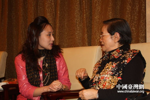 出席海峡两岸京剧艺术论坛的台湾海基会前董事长辜振甫遗孀、台湾中华妇联总会主任委员辜严倬云,在两岸京剧票友联谊活动现场演唱《锁麟囊》选段春秋亭。(中国台湾网 董洁 摄)