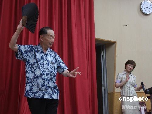 资料图:京剧大师梅兰芳之子梅葆玖(左)第三次访问台湾,六月二十一日应邀在台北科技大学演讲时,应京剧戏迷要求表演《霸王别姬》片断,其台湾女弟子魏海敏(右)作陪并在一旁认真学习揣摩。中新社发耿军 摄
