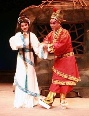 上海京剧院的“金嗓青衣”赵群(左)在剧中饰演弄臣的女儿,台湾当红花脸董洪松(右)饰演皇帝。(中新社)