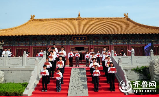 和谐中华·第二届海峡两岸经典文化推广会演"在济南府学文庙隆重开幕。海峡两岸2万余名学生,在18名"中国少年孔子奖"获得者引领下齐声诵读论语名句