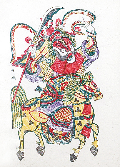 凤翔年画是西北地区的代表性年画,源于宋盛于清,是千百年来西北地区民俗民情的艺术反映。在雕刻艺术上,凤翔年画继承了秦汉唐宋石刻和壁画艺术端庄朴实、凝重大方的特点,揉进了本地刺绣剪纸的造型技巧,并借鉴了秦腔的表演艺术风格,强调夸张和变形,画面粗犷豪放而又鲜活灵动。凤翔年画工艺流程复杂,从画墨线稿到印刷要经过十三四道工序。由于地处西北受外部影响少,它保持了古版年画的纯粹民间风格,无论是人物还是花卉,造型都生动逼真。例如骑马的秦琼门神画就吸收了秦腔脸谱的变形艺术,人物双眉直竖、双眼喷火,下巴夸张变宽,具有杀气腾腾、镇妖除邪的威风感。