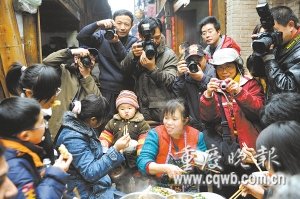 “在城里无法体会这种浓郁的年味,中山古镇的居民保持了最淳朴的民风,也沿袭了最传统的民间习俗。”李惠敏是一名数学老师,听说千米长宴消息后,她和几个朋友前一天就从江北来到中山等着。“这里的年味是最浓、最地道的,我明年还要来。”李惠敏说。(周立)