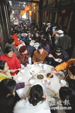 昨天,农历腊月二十八,重庆江津区中山古镇摆出千米长宴,800人同时下厨,2800余人共进午餐庆新春。这是中山镇第三次在春节前夕摆下千米长宴,今年前往吃长宴年饭的游客人数是历届最多的。