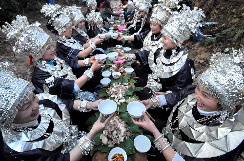 1月31日,剑河县南寨乡展留村苗族妇女吃“森林长桌饭”,相互敬酒。 当日是贵州省剑河县南寨乡展留村民间传统的“锡绣苗族姊妹节”的第二天。每年农历正月初五至初七为展留村举办“锡绣苗族姊妹节”的日子。节日期间,村民们举行祭祖、跳芦笙舞、吃“森林长桌饭”、马郎歌会等民俗活动。 新华社发(乔启明摄)
