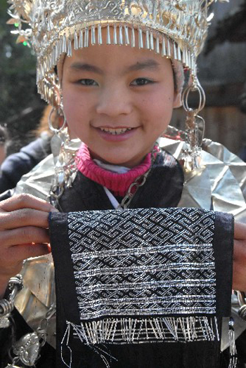 1月31日,剑河县南寨乡展留村的苗族儿童展示自己制作的锡绣工艺品。