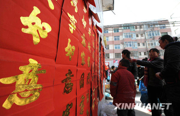 1月23日,两水镇群众在“年集”上挑选对联。新华社记者韩传号摄
