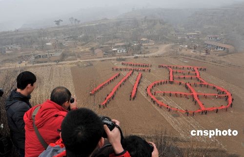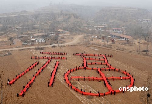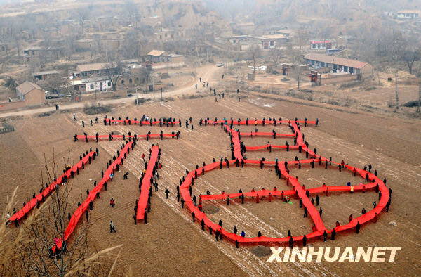 2月4日,太原市摄影家协会的上百名摄影师来到山西阳曲县安塘村,开展“送福到农家”活动,摄影师和安塘村村民在空地上用红布展示出一个3600平方米的巨型“福”字,以这种独特的方式欢庆新春,传递祝福,表达对新一年的美好期盼。此外,摄影师还为村民们免费拍摄全家福,并现场洗印出来相赠,受到村民的欢迎。新华社记者 燕雁 摄