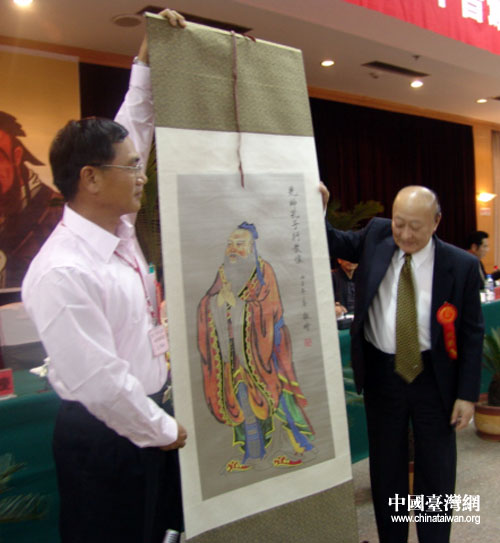 世界孔子后裔联谊会会长孔德墉(右)向台湾分会赠送孔子绣像 |