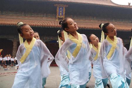 9月26日晚,2006中国曲阜国际孔子文化节暨“两岸孔子文化交流周”在山东省曲阜市开幕。9月27日,曲阜实验小学的学生在孔庙朗诵《论语》。