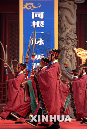 2006年9月28日,礼仪人员在山东曲阜孔庙进行祭孔乐舞表演。(图片来源:新华社)