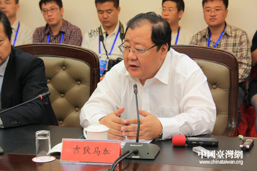 中共青海省委常委、宣传部长吉狄马加在记者见面会上致辞 (中国台湾网 杨峰 摄)
