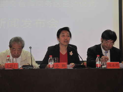 北京市台联会长苏辉(中)、北京市崇文区副区长周永明(右)在记者会上介绍台湾会馆和台湾商务区的相关情况。
