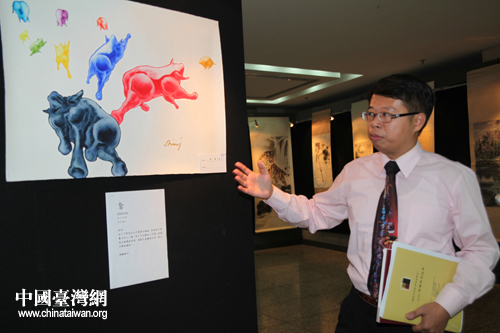 任教于台湾中华科技大学建筑系的蒋麟老师,自幼学习水彩。他说,水彩画多以风景、静物、人物等为题材。而在他的作品全部都是表达自己观念的想象之作。譬如这次的参展作品《奋》,在画面的左下方有一只巨大的黑牛,小牛在它背上奋力一跃,同时小牛上方亦有许多小牛相互映衬。对于这样的画作内容,蒋麟解释说,主要是表达团结合作、努力奋斗、不懈追求之意。
