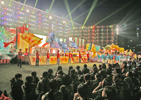 巴山竹海间升起一轮光照九州的明月,舞台上宛如银河泻地,西政民乐团的同学们抚琴奏笛,忽然间,伴随着奔腾的鼓声,西政学子琅声齐诵,诗韵婉转,词律铿锵。《月下独酌》《春江花月夜》《水调歌头》《静夜思》的联诵之中,独具重庆特色且失传800年的世界非物质文化遗产“鲤鱼灯”炫然出场,拉开了整场晚会的序幕。