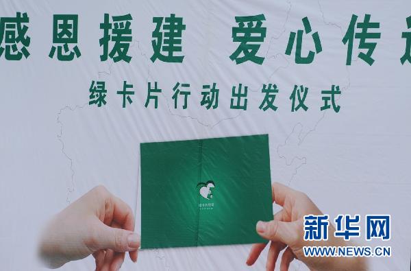 在四川灾区,来自全国各地的12万名援建者都将陆续收到一张张承载着感恩之情的“绿卡片”。这项吸引了近30万人参与的网络行动被称为“四川最大的民间感恩活动”。