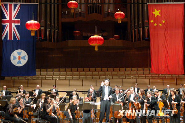 9月2日,在澳大利亚东部海滨城市布里斯班的昆士兰州表演艺术中心音乐大厅,来自中国香港爱乐乐团的副指挥苏柏轩与昆士兰交响乐团演出后向观众致谢。当日,为庆祝中华人民共和国成立60周年和中国传统佳节中秋节,以及昆士兰建州150周年,由昆士兰交响乐团和来自中国的年轻艺术家们在这里联袂演出一场题为“东西合璧”的音乐会。 新华社记者江亚平摄