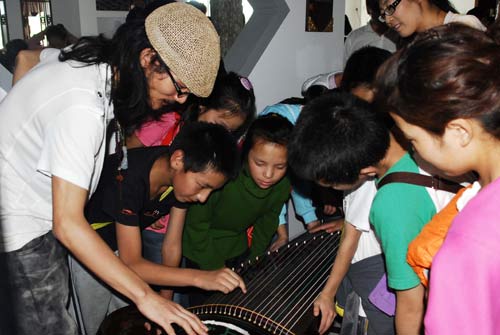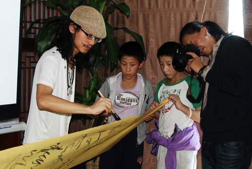 下午2时,被誉为“鬼才”的田七先生带着笔墨纸砚和古筝出现在22个孩子面前。则热福利院院长李星陆介绍说,在玉树地震中,该福利院的院墙都已经倒塌,无法使用。在北京市各界人士的关怀下,该福利院22名孩子来到了北京求学、居住,其中9名是震后孤儿,他们最小的8岁,最大的17岁。“今天很高兴鬼才田七先生能来的孩子们面前,希望这些心灵受过创伤的孩子们能以田七先生为榜样,热爱生活、善于发现美的东西、传承国学!”